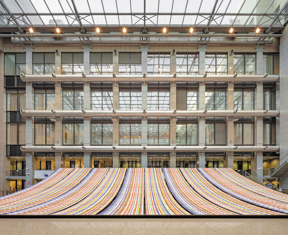 Depuis le 1er janvier 2022, et pour six mois, la France préside le Conseil de l’Union européenne. Pour habiller cette présidence, architectes et scénographes (Ateliers Adeline Rispal), associés à une agence de design et création graphique (Si - Studio-irrésistible) et à une agence de conception lumière (Les Éclaireurs), sous la houlette d’Adeline Rispal, ont fertilisé les imaginaires et investi les bâtiments Europa et Juste Lipse à Bruxelles. C’est Jeanne Goutelle, créatrice textile, exploratrice de matières et de couleurs, qui s’est imposée comme le cœur battant de cette installation. L’Étoffe de l’Europe, ambitieuse métaphore d’une Europe humaine et humaniste, tisse les liens entre les âmes européennes.