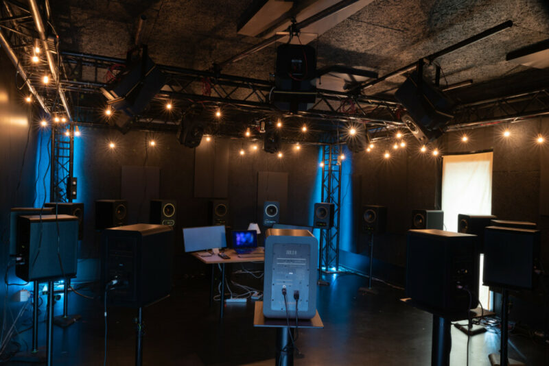 Une écoute au casque proposée via une application devant chacune de ces œuvres permettait d’écouter des capsules sonores produites et mixées par La FabSonic. La spatialisation des différents objets sonores a été réalisée à l’aide du logiciel SPAT Revolution de Flux :: Immersive. Dans le studio, un ordinateur player utilise le logiciel Reaper pour sa capacité à gérer des pistes multicanaux (jusqu’à 64 canaux)) et 128 depuis sa dernière mise à jour. Les sources sont envoyées vers le logiciel de spatialisation SPAT, hébergé ici dans un autre ordinateur, en utilisant le plug-in d’envoi SPAT Send. L’automation est pilotée en OSC. Un mixage binaural a ensuite été généré pour permettre une écoute immersive au casque. “Une des capacités propres au logiciel SPAT est de pouvoir gérer en entrée tous types de sources, de la mono/stéréo jusqu’aux sources ambisoniques de différents formats, et de les transcoder directement dans l’environnement de spatialisation utilisée. Une particularité indispensable pour permettre de gérer la grande diversité des formats de sons utilisés pour construire ses illustrations sonores”, explique Florian Chauvet de La FabSonic.