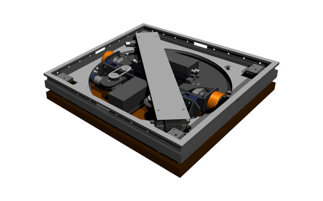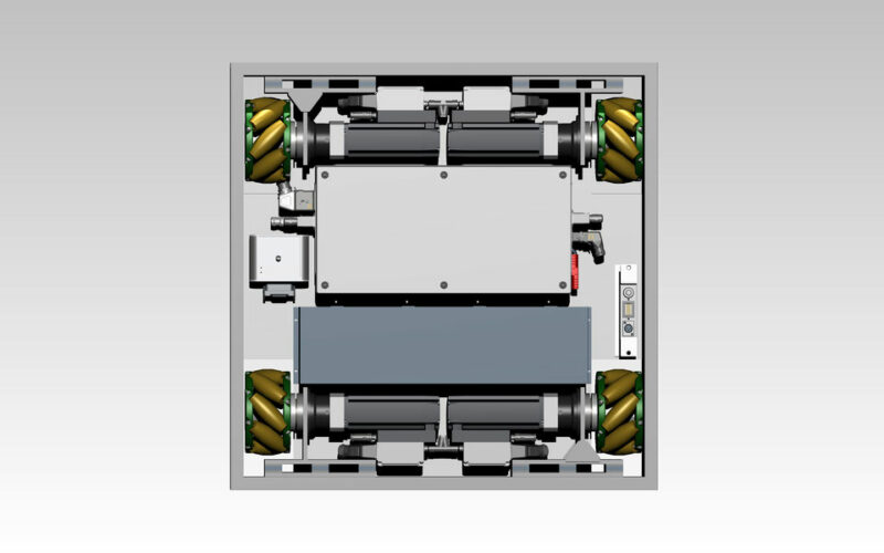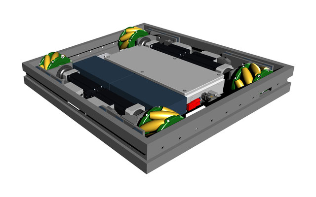 Le module d’entraînement « Servo » a des dimensions de 1 m x 1 m pour une hauteur de 16²/³ ou 20 cm. Un ou deux entraînements peuvent être disposés à l’intérieur d’un tel module. La version avec deux entraînements représente la plus petite unité dirigeable. Elle peut être utilisée comme entraînement pour des objets à déplacer de 1 m x 1 m à environ 3 m x 3 m. Pour les objets de plus grandes dimensions, on utilise deux modules avec chacun un entraînement. Ceux-ci doivent être placés au centre de l’objet à déplacer et le plus loin possible vers l’extérieur. Cela permet d’améliorer la manœuvrabilité et de contrôler l’objet avec plus de précision ; il est possible d’interconnecter jusqu’à seize modules et de déplacer ainsi une masse d’environ 45 000 kg :