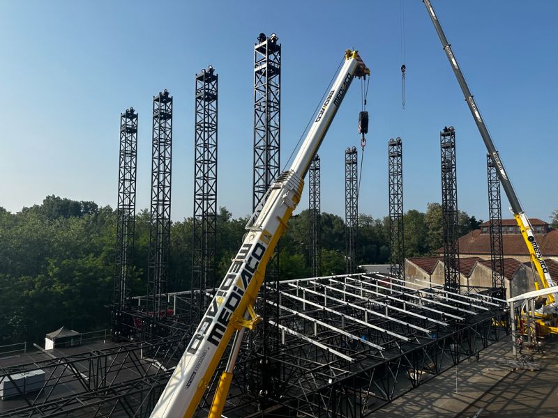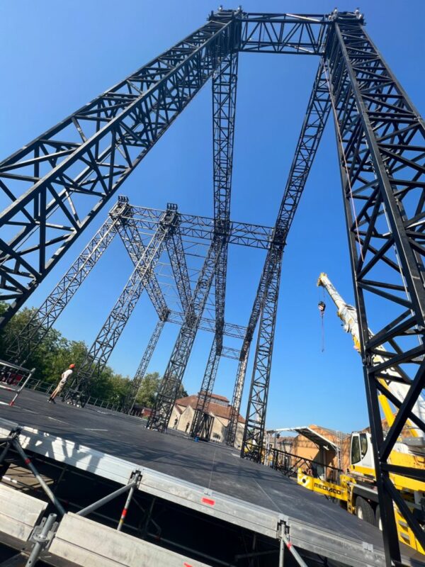 Les équipes qui assurent le montage durant tout l’été ont été formées lors de l’assemblage à blanc qui s’est tenu début juin en Alsace. Une semaine s’écoule généralement entre le début du montage et la fin du démontage sur un même site ; les équipes doivent donc être parées à monter la scène en seulement trois jours. Dans ce contexte, il apparaît important de former correctement les équipes et de les fidéliser.