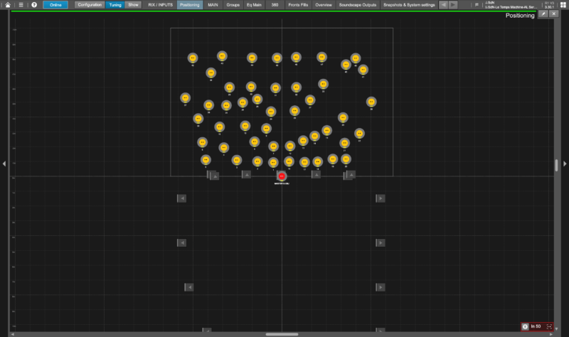 La grande salle étant déjà équipée en d&b, Clément Cano-Lopez s’est naturellement rapproché de Mathieu Delquignies, support d’application chez d&b, et de Boris Jacquier-Laforge, référent technique de Scène de Nuit, pour évaluer le passage à la spatialisation. Après une démonstration convaincante du système Soundscape et une simulation avec le logiciel de prédiction ArrayCalc intégrant les données de spatialisation, le système Soundscape a été préconisé. Il se compose du processeur indispensable DS100, associé à une configuration d’enceintes composée en face de 5 stacks de 2 x AL90 amplifiés par des D40 et en surround latéraux de 2 x 4 enceintes E8 alimentées par les nouveaux amplificateurs 4 canaux 5D. Les deux subwoofers J-SUB de l’ancienne diffusion ont été gardés mais dotés d’une nouvelle amplification aussi en D80, beaucoup plus puissante et plus dynamique.