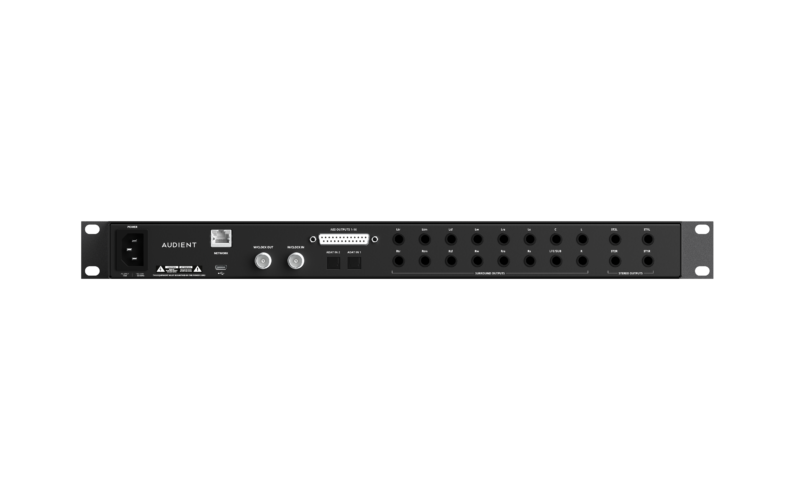 La connexion vers l’ordinateur se fait en USB-C. L’interface offre 16 sorties symétriques sur connecteur jack et 16 sorties AES sur connecteur subD qui seront dédiées au monitoring surround, plus deux sorties stéréo symétriques pour gérer deux systèmes d’écoute stéréo. Deux sorties casque indépendantes sont disponibles en face avant. En entrée, elle propose deux préamplis/lignes micro Audient dotée d’une connectique compatible micro, ligne ou instrument Hi-Z et de convertisseurs offrant une plage dynamique de 126 dB. Bénéficiant des avantages d’une conception analogique et d’un contrôle numérique précis, les niveaux d’entrée analogiques sont télécommandables via Ipad. 16 entrées ADAT et 16 entrées AoIP Dante via une carte optionnelle étendent le nombre d’entrées vers l’ordinateur ou permettent son utilisation comme système de monitoring avec une station de travail déjà existante. Une entrée/sortie Word Clock complète l’interface numérique.