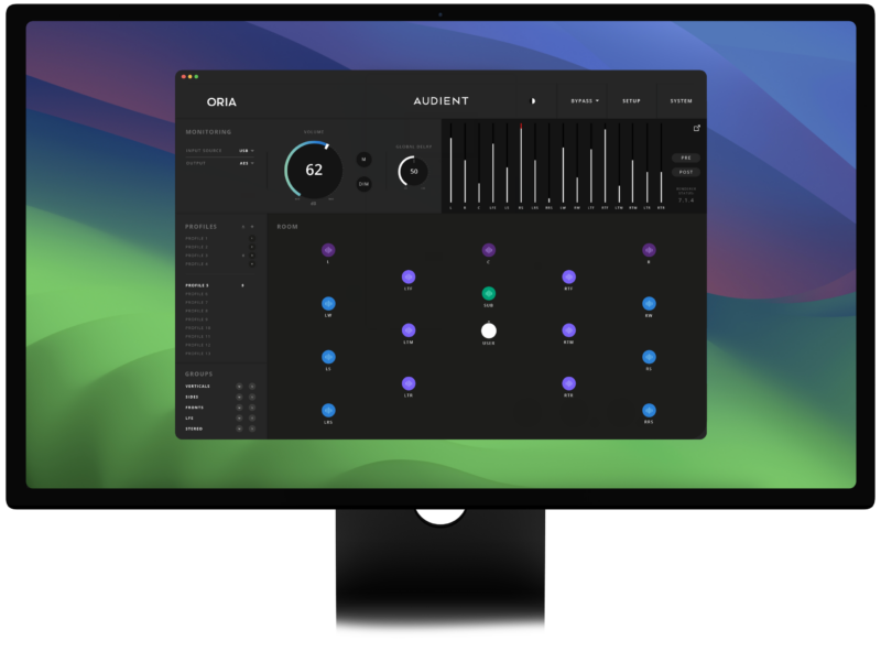 Une fois la calibration effectuée, ORIA garantit aux utilisateurs un contrôle total de leur environnement d’écoute, qu’il soit stéréo, surround ou immersif. À partir du panneau avant et surtout depuis son logiciel intuitif ou son app sur iPad, l’utilisateur navigue rapidement entre ses différentes configurations et contrôle ses niveaux d’’écoute, ses égalisations, … Des codes couleur identifient les groupes d’enceintes qui disposent de fonctionnalités de contrôle de volume, mute, solo. Pour les professionnels de la postproduction, un délai de synchronisation globale permet un calage parfaitement adapté de l’audio à l’image.