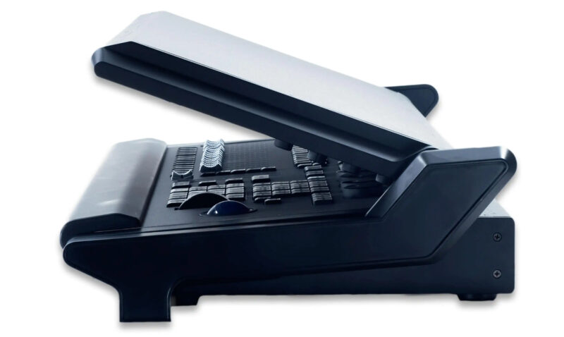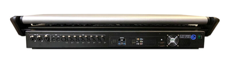 Pour la restitution des états lumineux, la console Vibe LX est pourvue de 15 faders motorisés, 35 touches d’exécution, un double fader de crossfade A/B, 5 faders non-motorisés, et un nombre pratiquement illimité de touches et de faders virtuels. Pour la programmation et l’édition, elle dispose de quatre roues codeuses rétroéclairées RGB, un trackball XY, une roue de contrôle de l’intensité, quatre encodeurs rotatifs liés à l’écran 11,6″ et bien sûr d’un pavé numérique. Le clavier alphanumérique est accessible depuis un tiroir.