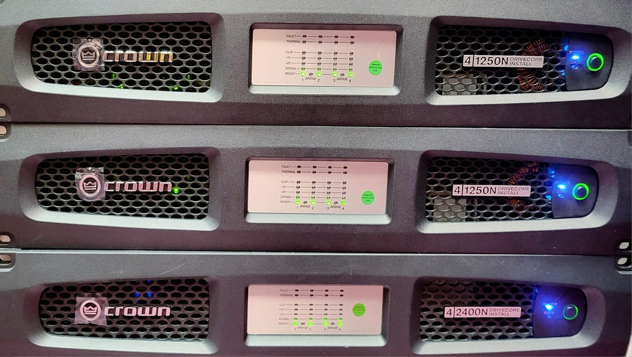 Le nouveau système de sonorisation met en œuvre vingt-trois enceintes JBL, toutes suspendues. Treize enceintes AWC159 gèrent la diffusion vers les tribunes principales et le terrain. Six enceintes AWC129 sonorisent la partie opposée de la patinoire. Quatre subwoofers ASB6128 permettent d’offrir un renfort de graves totalement nécessaires pour les applications de loisirs. L’ensemble est alimenté par des amplificateurs Crown dont un DCI42400N et deux DCI41250N qui intègrent une connexion réseau Blu-Link pour recevoir les signaux à partir d’un processeur programmable BSS BLU-100. Sa programmation sur mesure permet de gérer la diversité des sources (stéréo, bord de patinoire, dj’s en cabine et microphone HF) et le zonage. Deux platines murales Contrio EC-4BV et EC-8BV permettent la mise en service de scénarios de diffusion en fonction de l’activité, avec réglages de volumes et ouverture/fermeture d’espaces de diffusion.