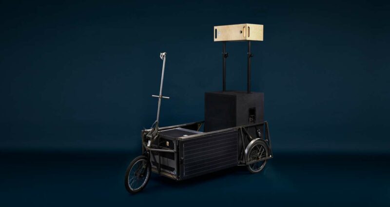 Les remorques de sonorisation itinérantes Veloma intègrent des panneaux solaires rétractables pour une recharge en continu. Elles sont motorisées avec assistance, contrôleur et freinage à inertie. Leur largeur totale inférieure à 1 m leur permet de circuler sur les pistes cyclables.