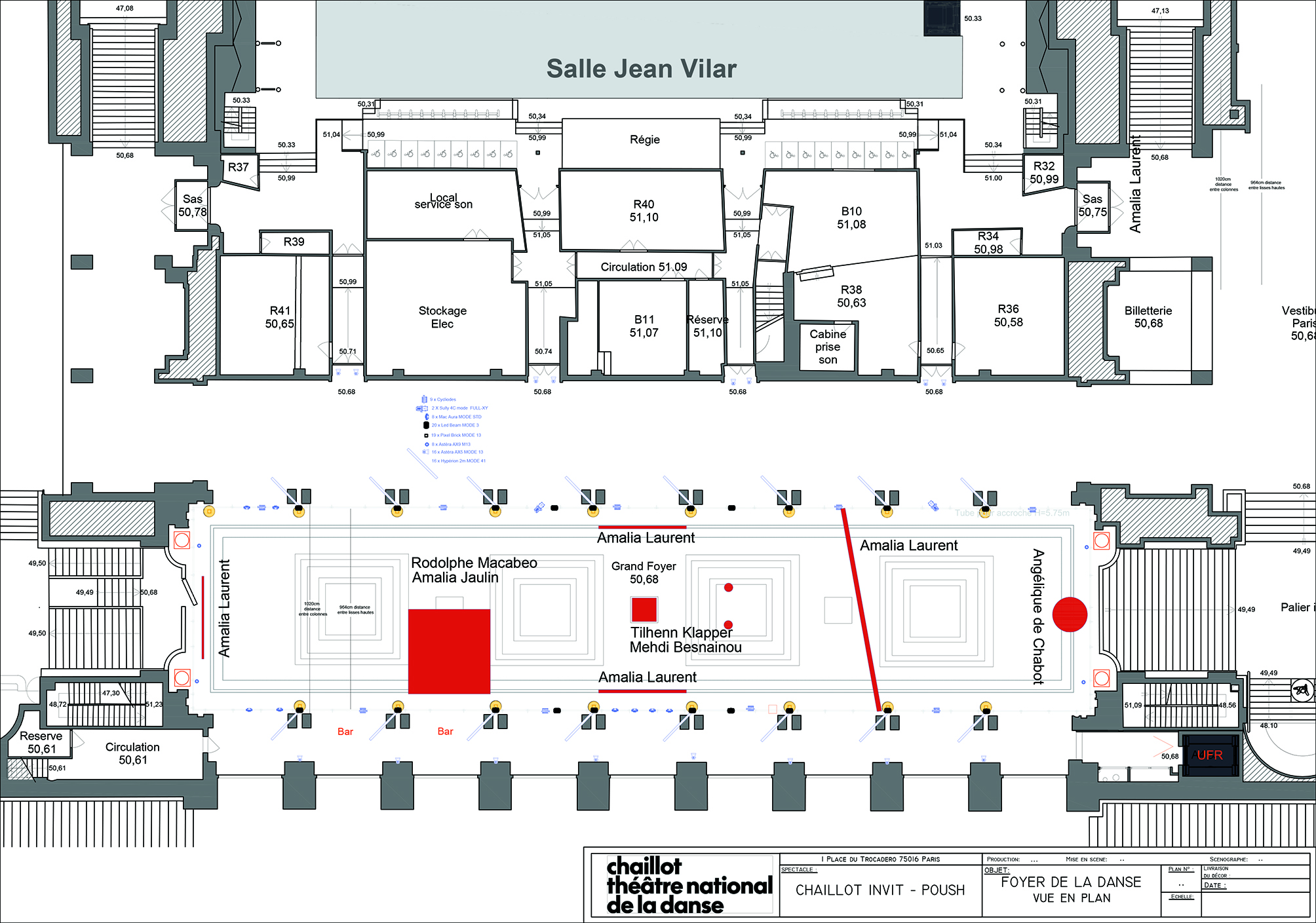C’est ainsi que s’imagine pour la seconde année consécutive la programmation POUSH au Théâtre avec une exposition, une déambulation et trois performances. L’ambition de la soirée est de sublimer l’architecture du Théâtre et principalement le foyer de la danse où nous retrouvons les plus grandes fresques d’un bâtiment désigné musée d’art mural dès son inauguration en 1937. Le Grand Foyer est en effet l’œuvre d’une collaboration : d’un côté le peintre décorateur Gustave-Louis Jaulmes (1873-1959) se voit confier une quarantaine de mètres de mur ainsi que deux panneaux situés aux extrémités de la pièce, et de l’autre l’architecte Louis Süe (1875-1968) dessine le mobilier, les ferronneries et les luminaires. La présence de ces œuvres au sein de l’espace du Grand Foyer classe le bâtiment aux monuments historiques en 1980.