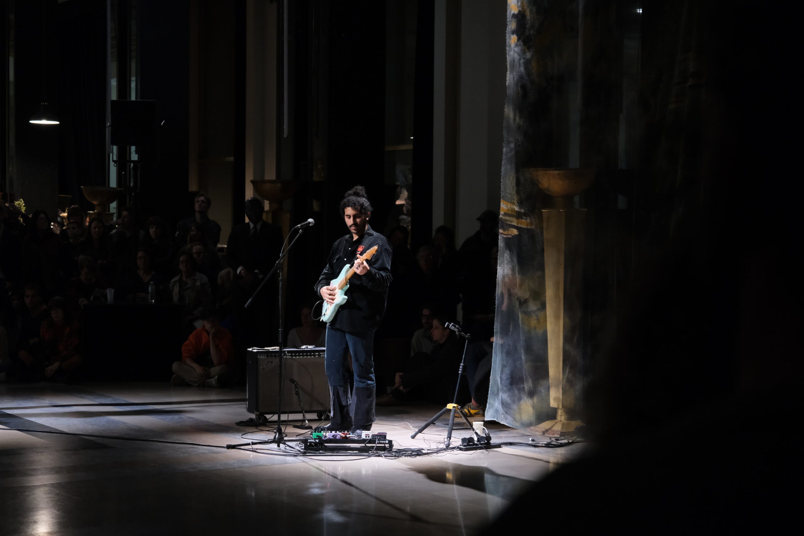 Mais c’est également l’œuvre des technicien.ne.s qui ont œuvré à la métamorphose de ce site. Julien Melia, l’un des deux régisseurs lumière de cet événement, explique lors d’un entretien qu’une “appropriation progressive de l’espace est à l’œuvre avec la mise en place d’un kit d’exploitation depuis 2023”. Ce kit se compose principalement de LED Beam, d’Astera AX5 et d’Hyperion (tube LED de plus de 2 m), et est implanté de manière particulièrement régulière depuis les colonnes de la salle. Alors que la soirée se construisait en près de trois états distincts, l’installation de ce plan feu permet une mise en lumière continue des toiles d’Amalia Laurent qui rythmait l’espace mais également une conduite propre à chaque performance. L’ajout d’Astera PixelBrick que l’équipe technique manipulait à la main a complété ce setup et accompagné la déambulation d’Angélique de Chabot.