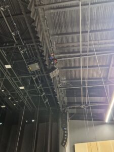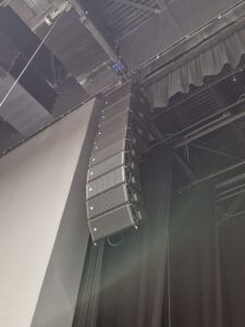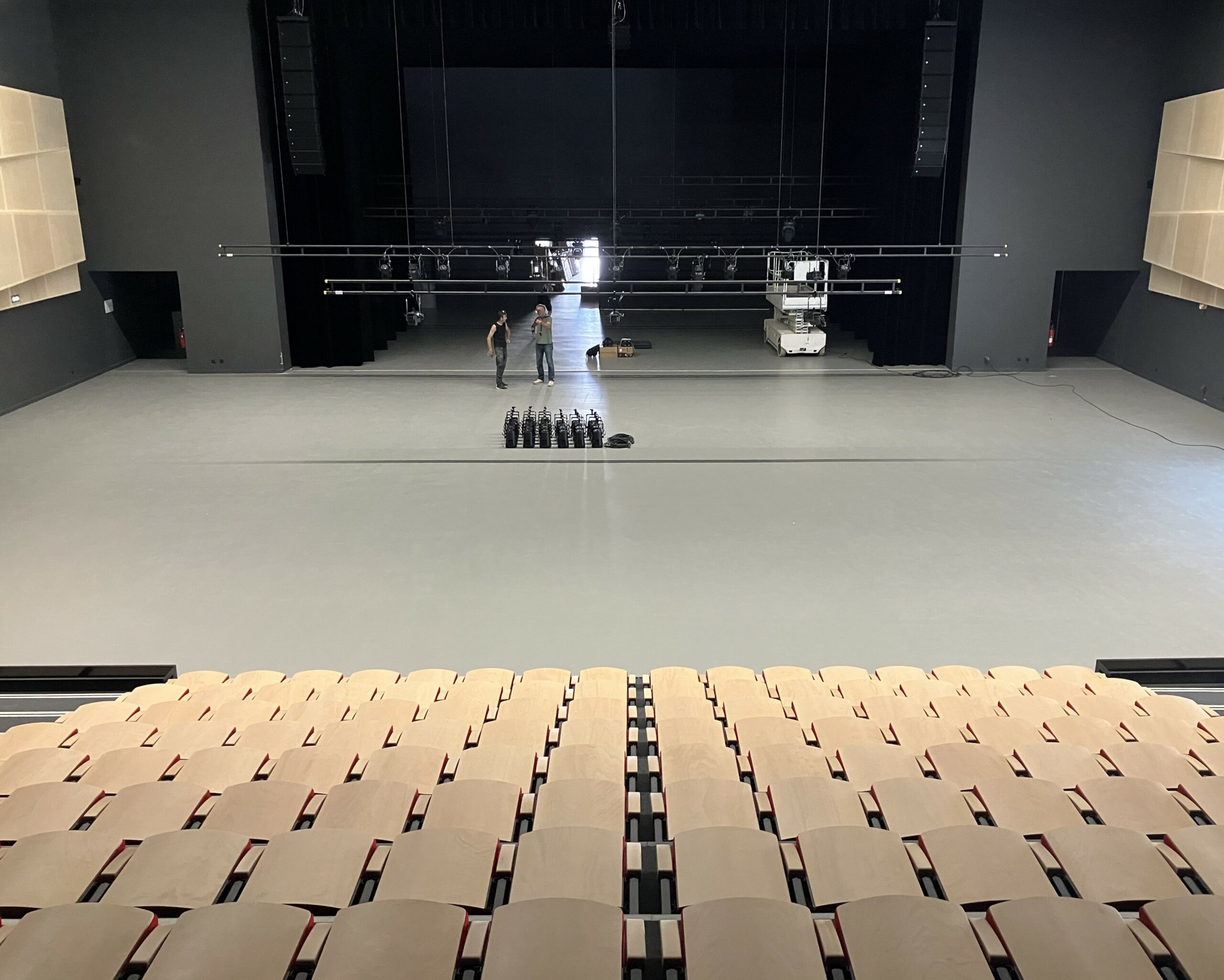 Pour répondre à ce cahier des charges inscrit dans une ligne budgétaire milieu de gamme, c’est un système de diffusion RCF qui a été retenu, dans une conception line array permettant d’offrir une couverture sonore cohérente sur toute la profondeur assez importante de la salle. Il se compose de deux clusters latéraux intégrant chacun six enceintes amplifiées HDL 30-A et trois subwoofers amplifiés HDL 38-AS. La salle disposant de gradins mobiles de 524 places et offrant un parterre proche du cadre de scène (500 chaises maxi), un cluster central a été ajouté, composé de trois enceintes amplifiées HDL 26-A. Sur scène, huit retours NX 15-SMA complètent l’installation. “Il n’y a pas de front fill sur cette installation. Le cluster central suffit à homogénéiser la couverture sonore sur les premiers rangs”, explique Christophe Ferrari, responsable intégration chez Dushow. “Le système se compose entièrement d’enceintes amplifiées. Nous avons donc réalisé du câblage en modulation, en réseau et en courant pour ses différents éléments. L’ensemble du système de diffusion est piloté en RDNet via le RDNet Control 8 gérant l’intégralité des traitements dont les filtres FirPhase avec une latence système minimale. La forte réactivité de l’équipe terrain de RCF a été très appréciée lors de l’installation, de la conception jusqu’au calage système.”
