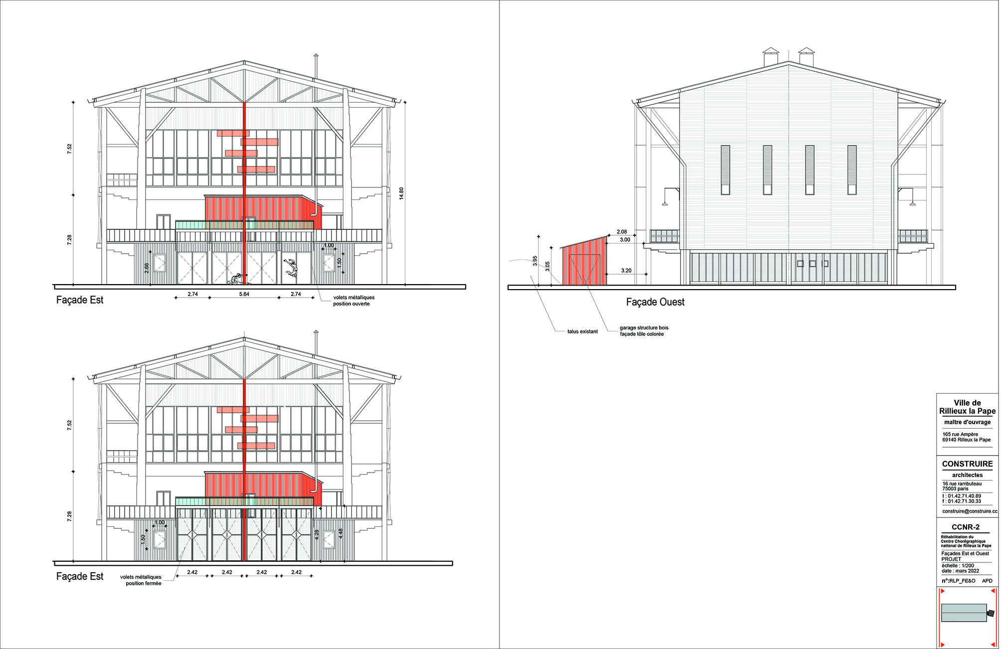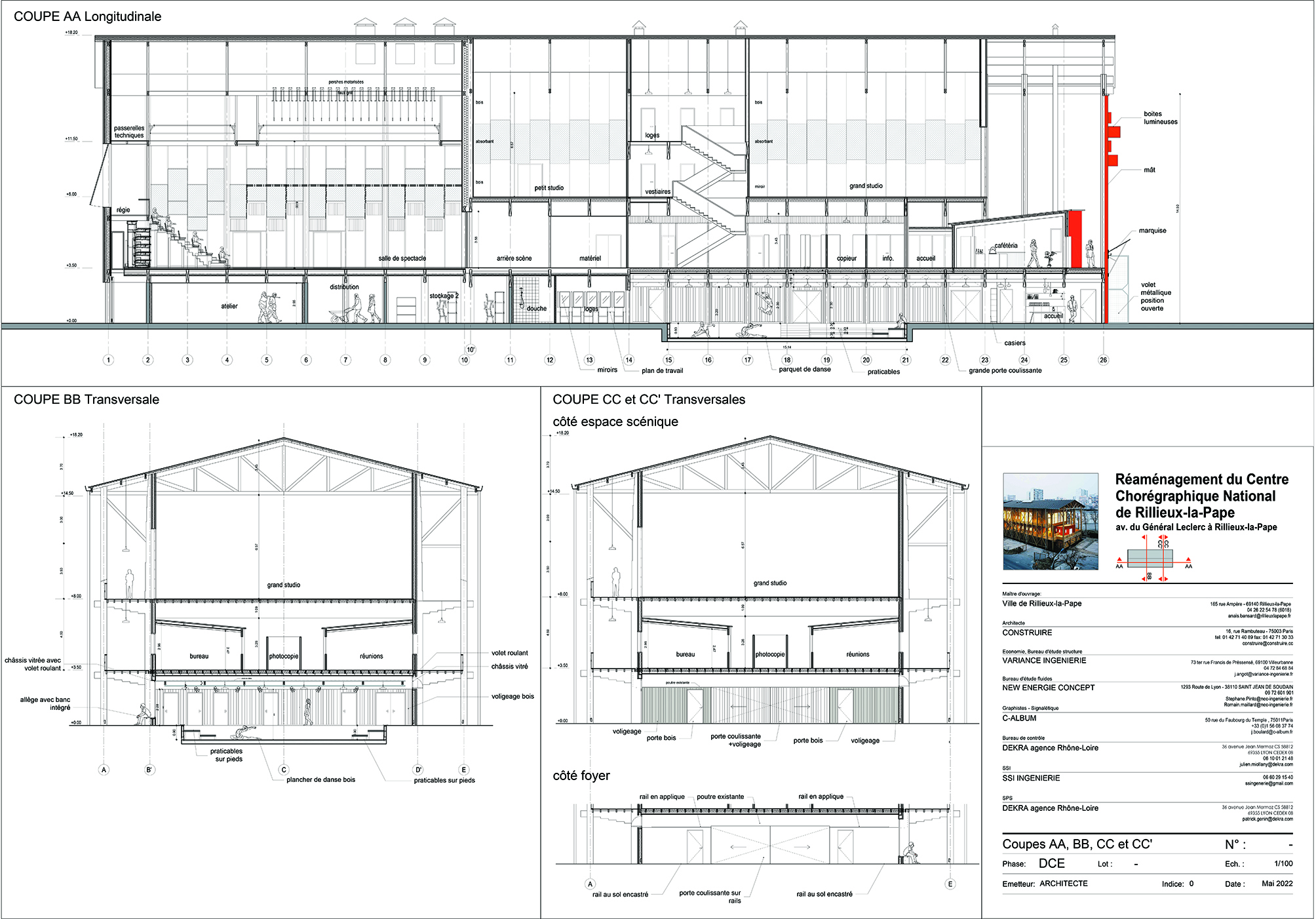 Une année après diverses investigations, accords avec assurances et financiers, une maîtrise d’œuvre est nommée pour mener la reconstruction à l’identique avec un premier calendrier offrant une fin de travaux fin 2020. L’agence Construire, avec Loïc Julienne, est initialement retenue. Un projet ambitieux et pertinent voit le jour mais la réalisation se voit confiée quelques mois plus tard à une nouvelle maîtrise d’œuvre, l’agence Reciprok devenue aujourd’hui Neria Ingénierie. Le bâtiment est sécurisé et intégralement fermé au public, bien que seule une petite partie du bâtiment fût touchée. Il se passe ainsi tout le contraire des recommandations du Ministère faites au CCNR bien avant l’incendie fin 2015 qui voyait une plus grande ouverture vers le quartier. Si les objectifs d’un CCN (Centre chorégraphique national) s’écartent, l’équipe n’abdique pas.