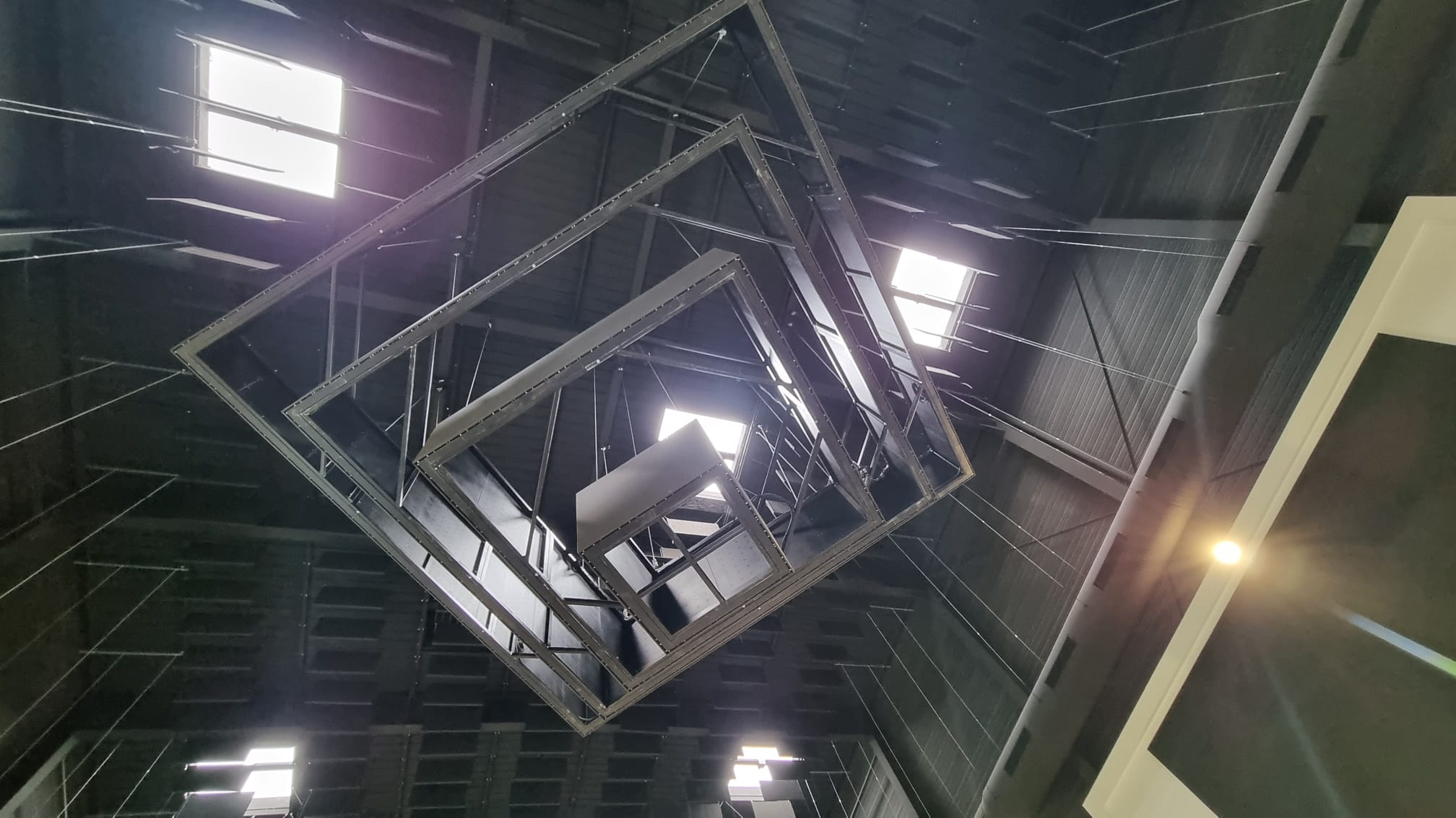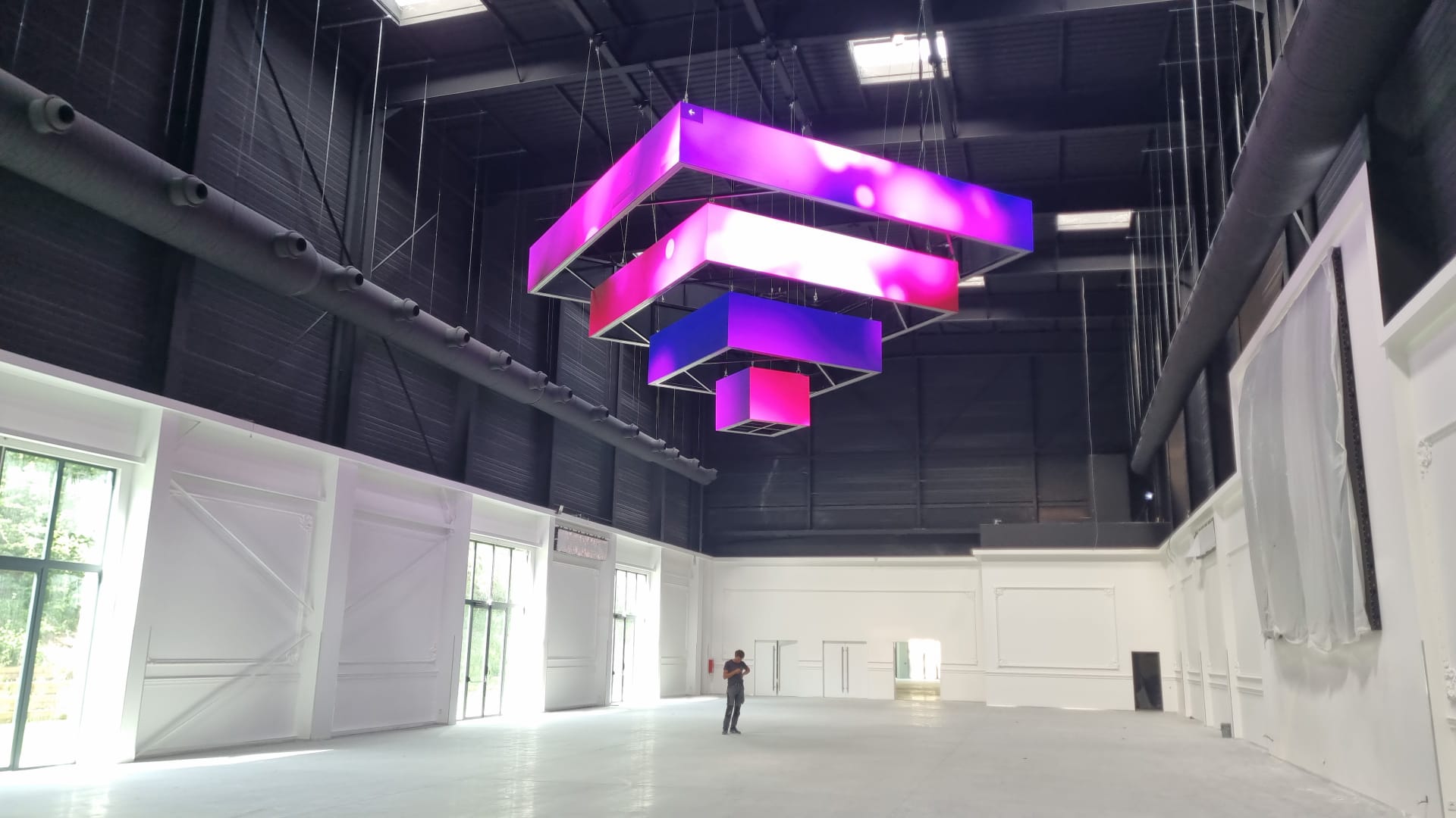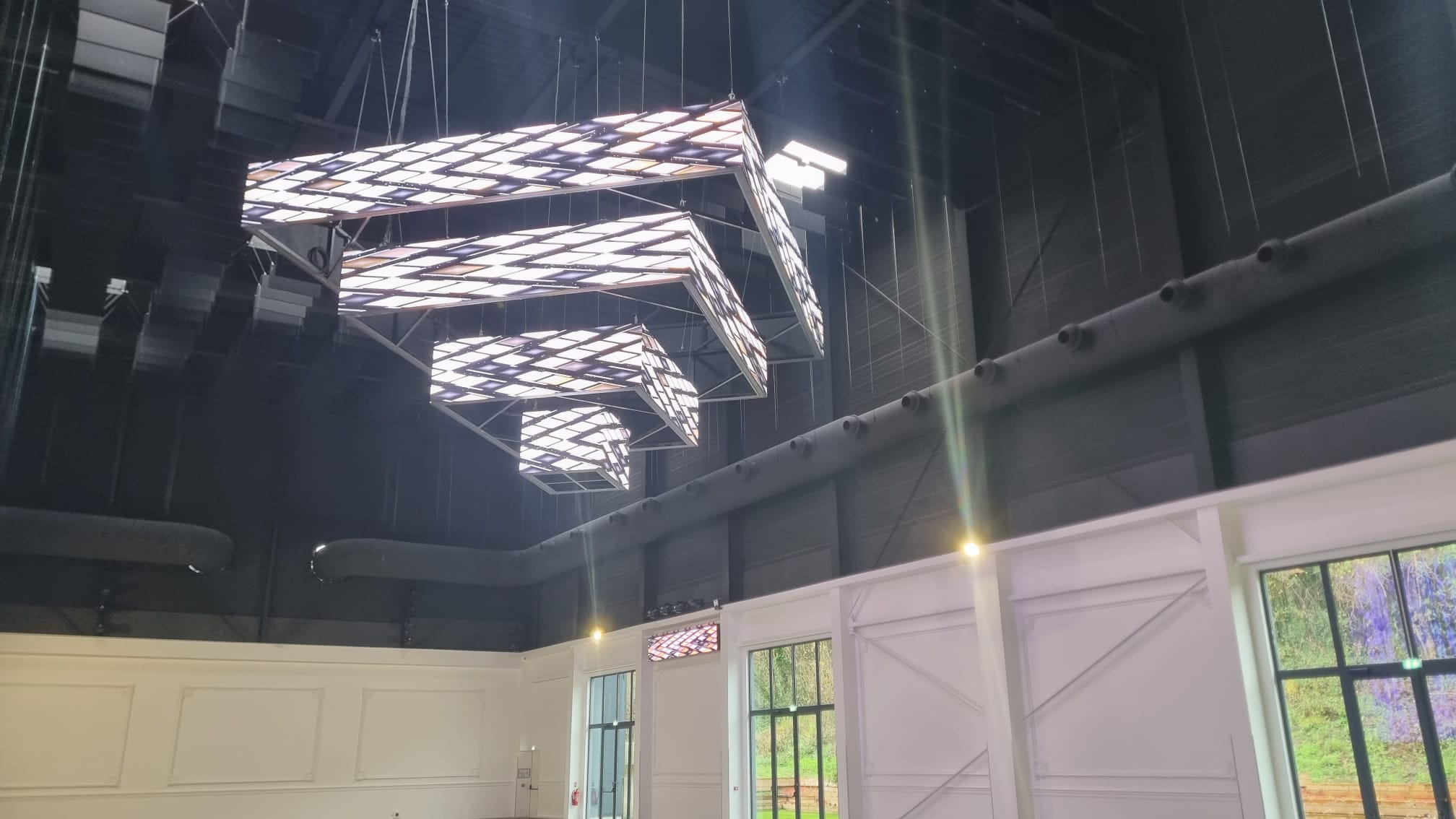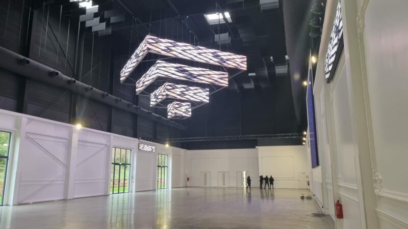 Ce lustre sur mesure et son système d’accroche ont été conçus et fabriqués par la société ARTBOX, d’après une conception 3D élaborée par Stardust Group. Il est composé de quatre éléments carrés de 1 m de haut complètement indépendants, le plus grand de 7 m de côté, puis 5 m, 3 m, jusqu’au plus petit de 1 m. Avec un poids total de 3,2 tonnes, le lustre est suspendu à 15 m de haut sur 24 points d’accroche. Les quatre éléments ont été assemblés et testés au sol, puis hissés et positionnés à l’aide de six moteurs. Ses dalles vidéo sont en pitch 3,9 et en finition full black (comme l’intégralité des autres écrans LED installés dans le lieu). Les dalles de chaque extrémité sont biseautées pour venir épouser parfaitement les angles et permettre la diffusion de l’image sans rupture ni bord noir sur la totalité du périmètre. Dans la même salle, un mur de LED de 7 m x 5,10 m et quatre bandeaux de 4,50 m x 0,65 m complètent le dispositif de diffusion vidéo. La deuxième salle du complexe, de taille plus réduite, le salon Gabriel, dispose également d’un écran LED de 5,70 m par 3,80 m.