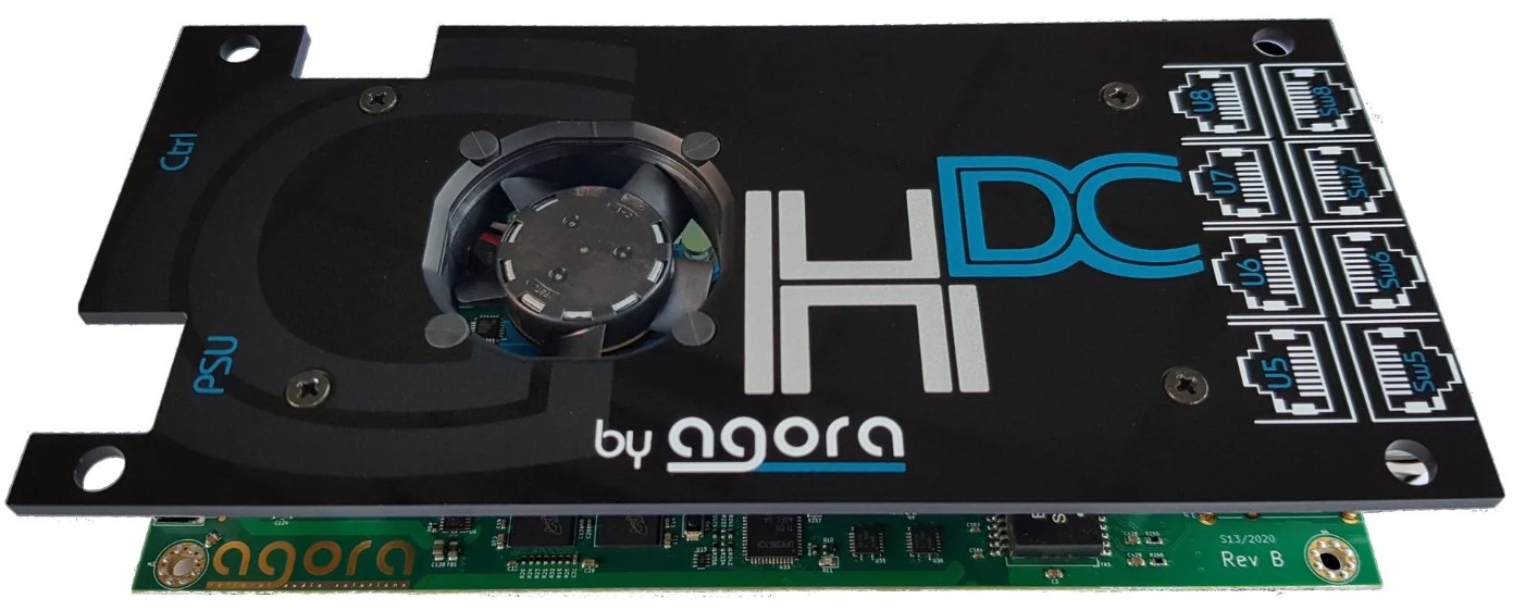 Le temps de latence de traitement est inférieur à 10 nanosecondes (“Cut-through”). Les fonctionnalités de la carte H-DC se contrôlent à l’aide du logiciel Agora Controller. Cette extension au switch Ghost-mk2 peut être largement utilisée dans un grand nombre d’applications (tournée, spectacles, événements, installations fixes et broadcast) en s’adaptant à différents protocoles audionumériques.