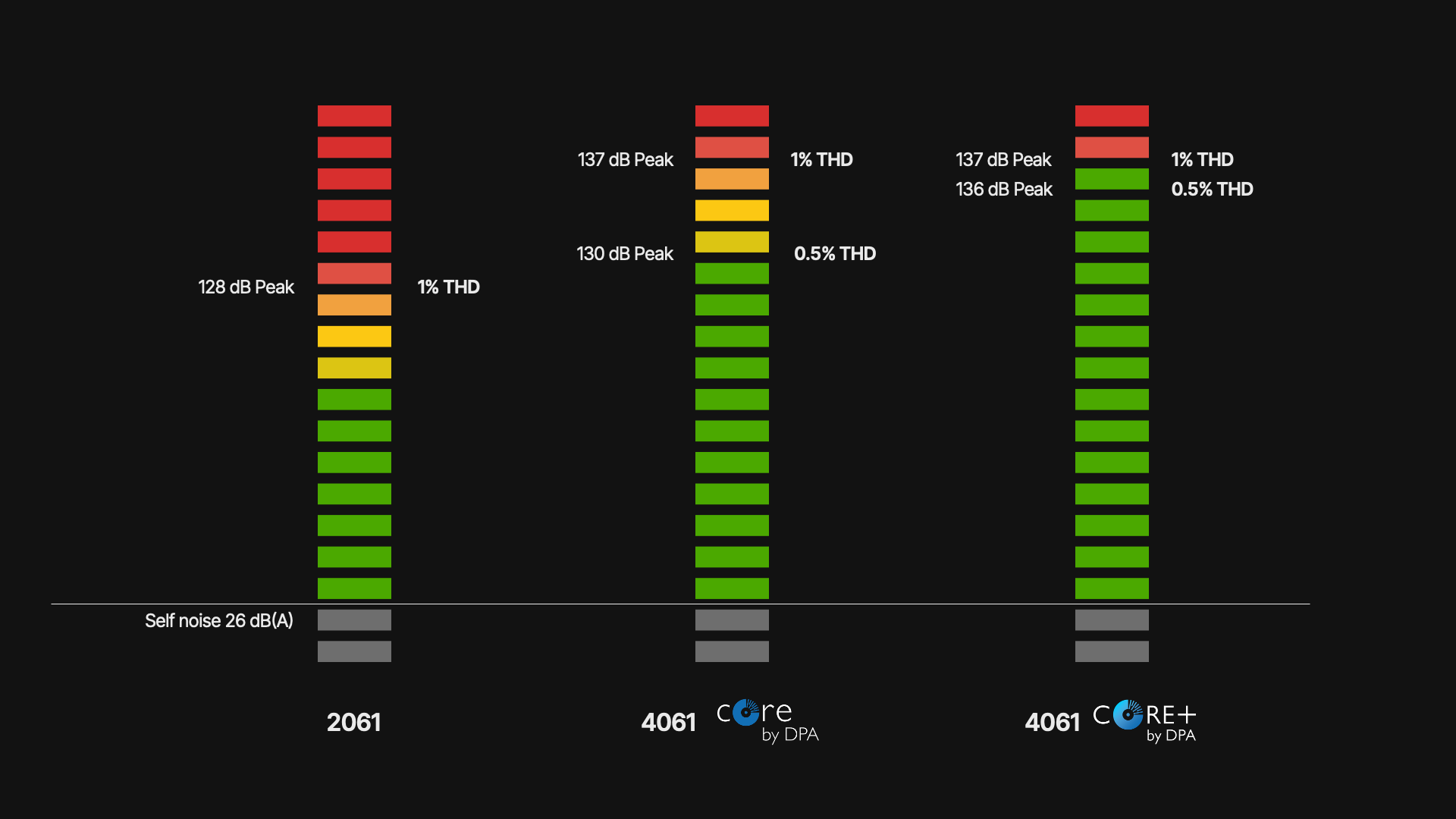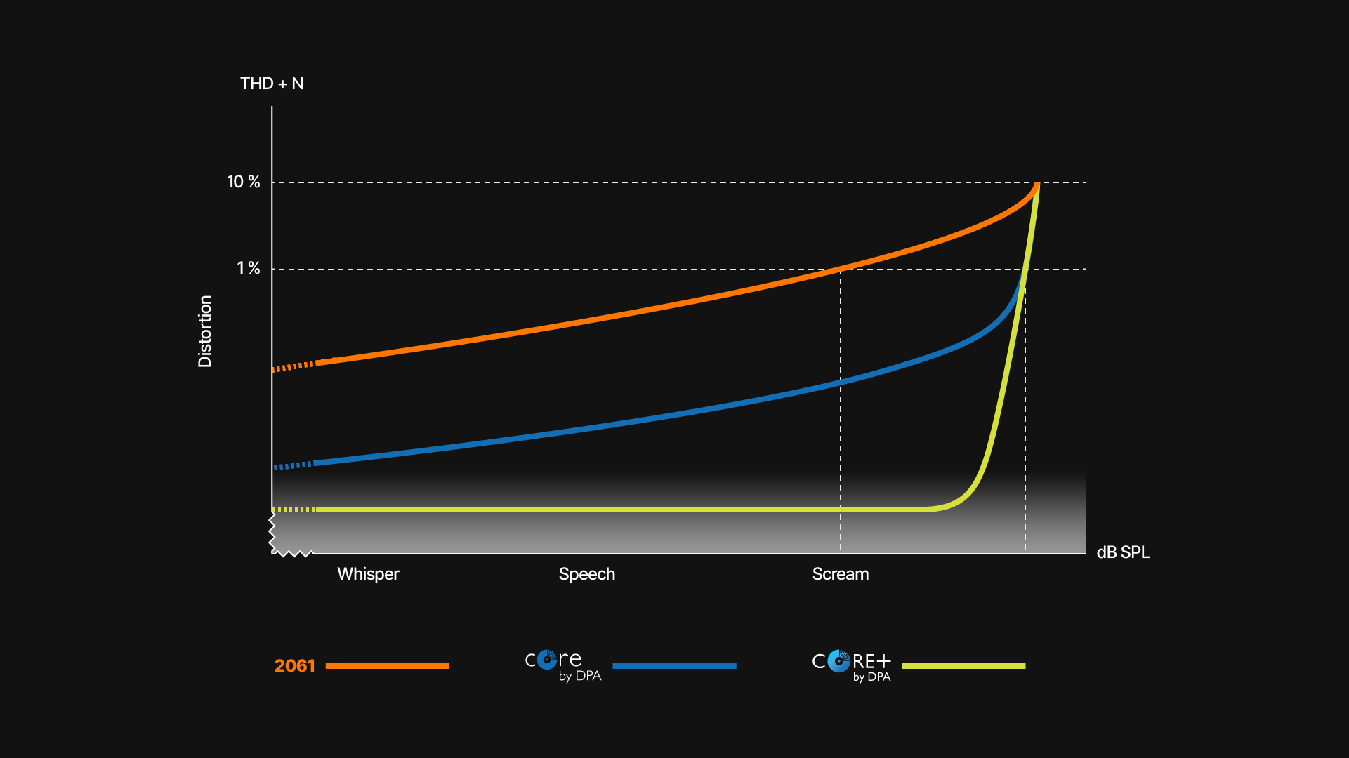 Tous les microphones DPA équipés de la technologie CORE+ conserveront leurs caractéristiques d’origine, notamment la plage dynamique et le niveau de bruit. Pour illustrer l’avantage de la distorsion réduite du CORE+ dans ses spécifications, DPA est en train d’ajouter un nouveau point de référence pour les performances THD à 0,5 %. Tous les microphones DPA partageant la même signature sonore, il sera toujours possible de mélanger de manière homogène plusieurs micros DPA de technologies différentes CORE et CORE+ au sein d’une même production.