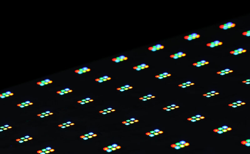 Le LiteTile Spectrum est équipé du tout nouveau moteur additif LED Spectrum Ultra, qui représente une avancée significative en matière de chromaticité dans les produits LiteGear. Ce moteur LED est composé d’une matrice RGBALC (Rouge, Vert, Bleu, Ambre, Lime, Cyan), capable d’offrir une gamme de couleurs et de couvrant 90 % de l’espace colorimétrique Rec.2020 (LiteGear annonce ainsi dépasser de 15 % les capacités du matériel standard actuel). Cette matrice LED permet une reproduction fidèle des couleurs sur une plage de températures de couleur étendue, allant de 1 700 K à 20 000 K. Par rapport aux générations précédentes de LiteTile (disponibles en blanc chaud et blanc froid), le Spectrum Ultra présente une augmentation de 20 % de la luminosité, tout en conservant une consommation énergétique identique. Cette amélioration s’accompagne d’une capacité de gradation fluide, permettant des transitions homogènes jusqu’à l’extinction complète.