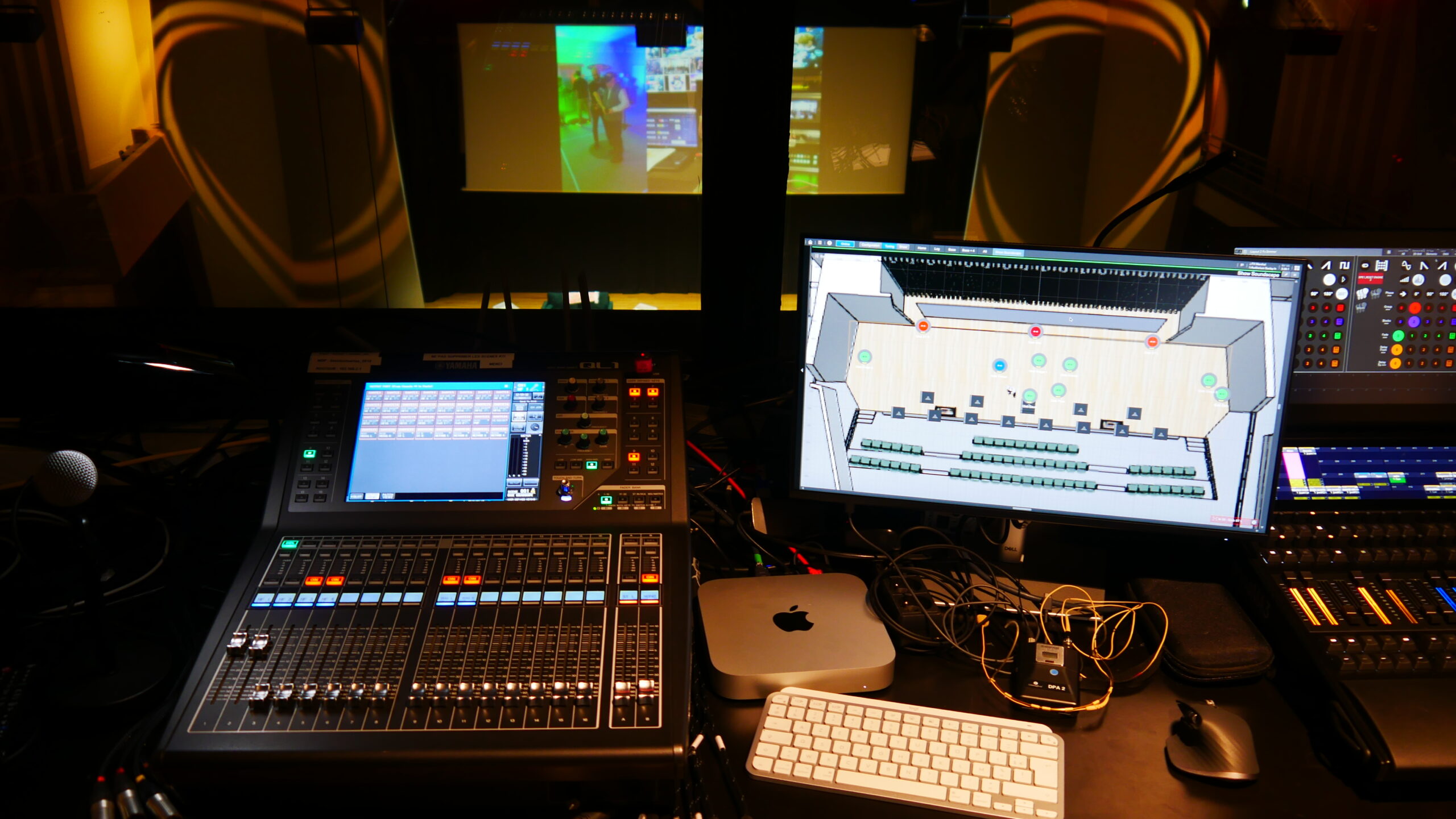 Le système de diffusion spatialisé d&b installé exploite une matrice de spatialisation DS100 64 canaux permettant de mixer 64 objets sonores vers 64 sorties. Il est alimenté via un réseau Dante et des switchs Yamaha SWP1-16MMF par les sorties directes post fader d’une console Yamaha QL1 recevant les différentes sources micro et lignes du plateau et de la régie. En sortie, il distribue l’audio vers le système de diffusion spatialisé composé au total de 20 enceintes dont cinq Y7P formant une ligne de face suspendue en haut de scène, cinq Y7P formant une ligne de rappel, et huit d&b 44S formant une ligne de front fill, complété au centre par deux caissons de basses cardioïdes 27S-SUB. Quatre retours de scène E8 complètent l’installation. L’amplification est assurée par des 10D pour les Y7P et les subs et des 5D pour le front fill et les quatre retours indépendants.