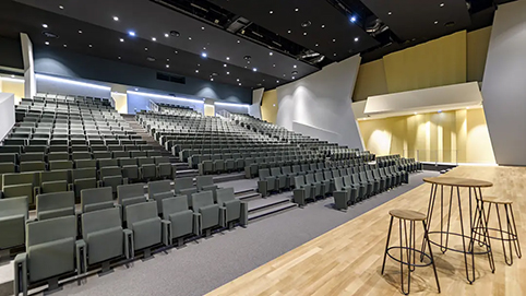 Le Business Center met à disposition des entreprises des salles de réunion dans une formule souple et autonome de location à la journée. Leurs équipements audiovisuels prêts à l’emploi grâce à des configurations prédéfinies sont utilisables sans technicien et reposent sur une domotique Extron, une installation vidéo Epson, Samsung et une installation audio à base de plafonniers et de matrices audio Yamaha plus une microphonie sans fil Sennheiser. Des capteurs infrarouges prennent en compte le déplacement des cloisons amovibles pour ajuster la diffusion audio et vidéo à l’espace ainsi créé, jusqu’à une salle plénière totale de 120 m2. Sur demande, STARDUST Group apporte des prestations complémentaires comme la traduction simultanée, la captation ou le streaming.
