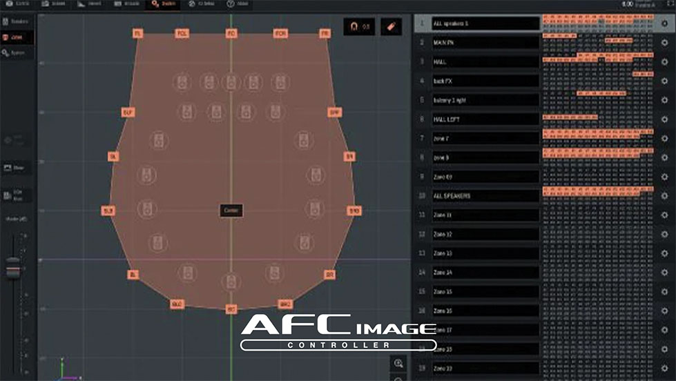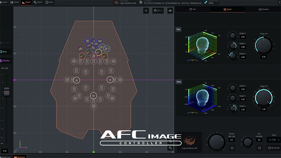 Le logiciel AFC Image prend en charge le mixage basé sur les objets à l’aide d’un algorithme de panoramique d’amplitude basé sur la distance (DBAP). Les objets peuvent être déplacés facilement et en douceur dans n’importe quelle direction grâce à une interface utilisateur intuitive. S’appuyant sur une expertise en conception acoustique architecturale et facilité par la puissance de traitement du DME10, le logiciel AFC Image inclut une réverbération 3D de haute qualité. Celle-ci peut être utilisée comme effet sonore pour ajouter une atmosphère spatiale au contenu et calcule automatiquement le réglage de la réverbération en fonction de la position de l’objet pour garantir un son naturel. AFC Image est compatible avec les consoles de mixage Rivage PM Series et DM7 Series. La position des objets peut être contrôlée à partir de l’écran tactile de la console, comme le fader principal d’AFC Image ainsi que le fader de la réverbération 3D.
