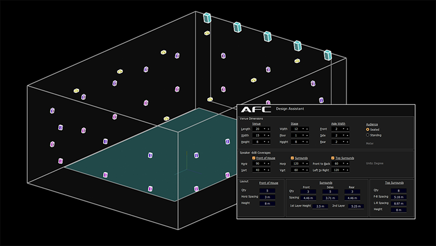 L’audio immersif nécessite une mise en place très précise des enceintes pour atteindre son objectif. Lorsque l’utilisateur spécifie des paramètres tels que les dimensions du lieu, les dimensions de la scène et la largeur des allées, l’assistant de conception AFC fournit les lignes directrices nécessaires pour le nombre et l’emplacement des enceintes afin d’offrir une expérience audio immersive complète à l’ensemble de l’auditoire.