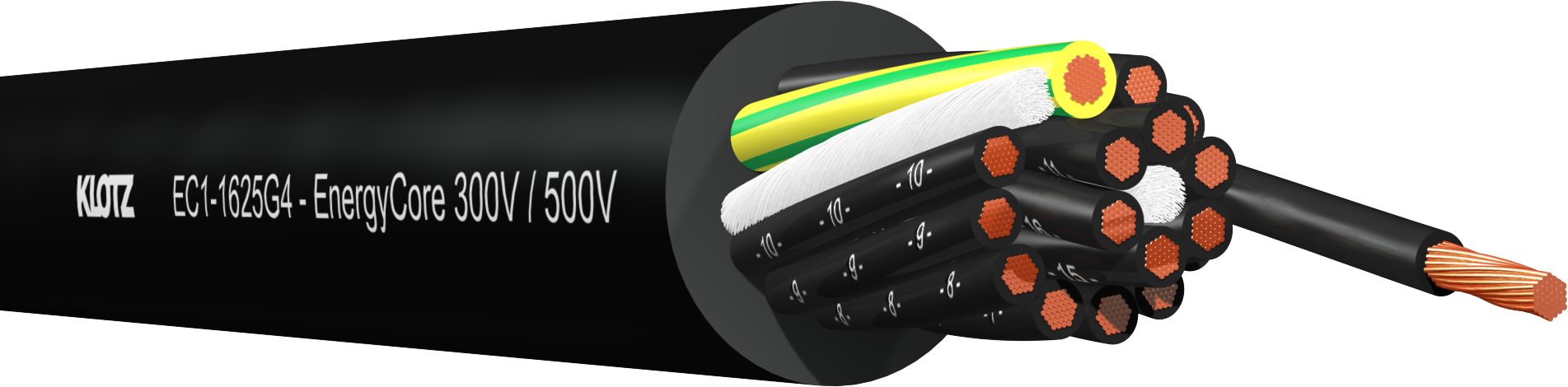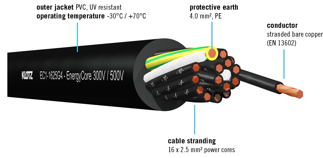 Le câble KLOTZ EC1-1625G4 permet de transporter et distribuer des alimentations de tensions nominales 300/500 V sur de longues distances dans un environnement professionnel. Il est constitué de 16 conducteurs d’alimentation de 2,5 mm² et d’un conducteur de terre PE de 4,0 mm², conforme à la norme IEC 60228 (classe 6) avec une longueur de torsion courte. Contrairement aux conducteurs de terre de 2,5 mm² utilisés couramment dans les câbles d’alimentation classiques, celui de 4 mm² garantit une protection maximale jusqu’à 16 A, même sur de longues distances allant jusqu’à 90 m.