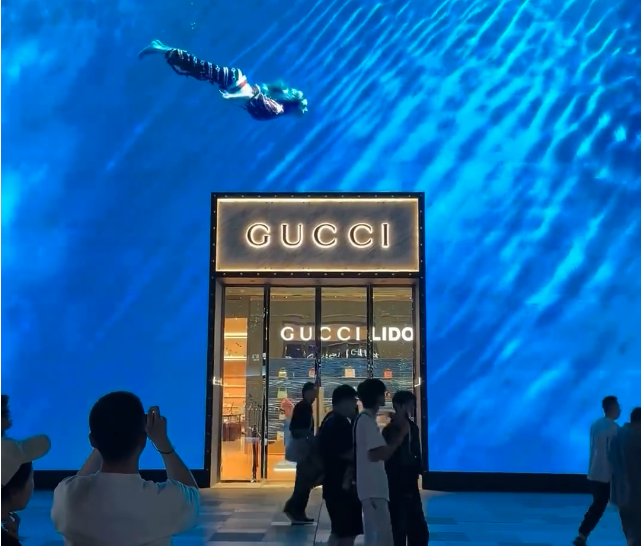 La vitrine du magasin Gucci à Chengdu est un exemple remarquable de l’utilisation de technologies avancées pour créer une expérience immersive et dynamique. Voici un
